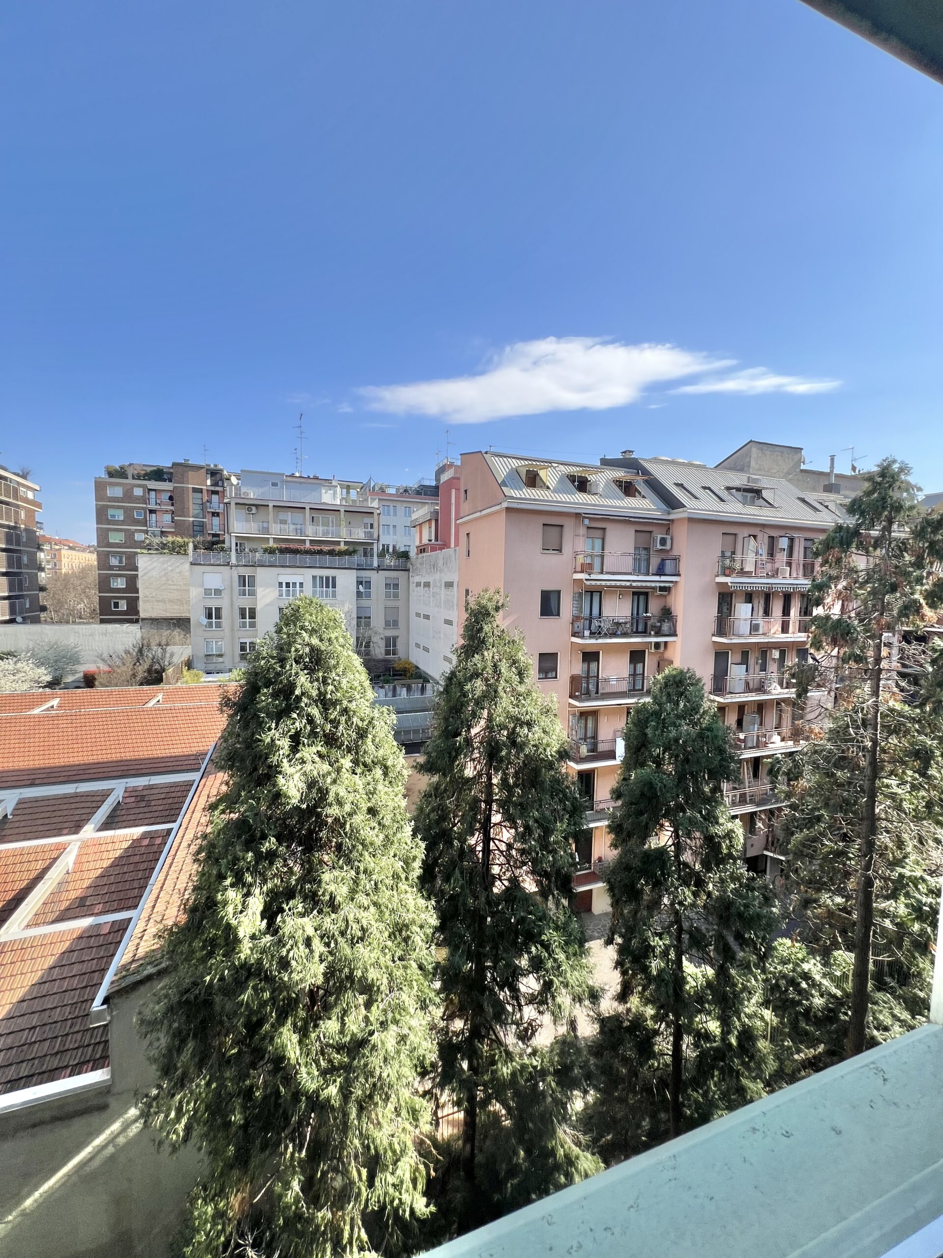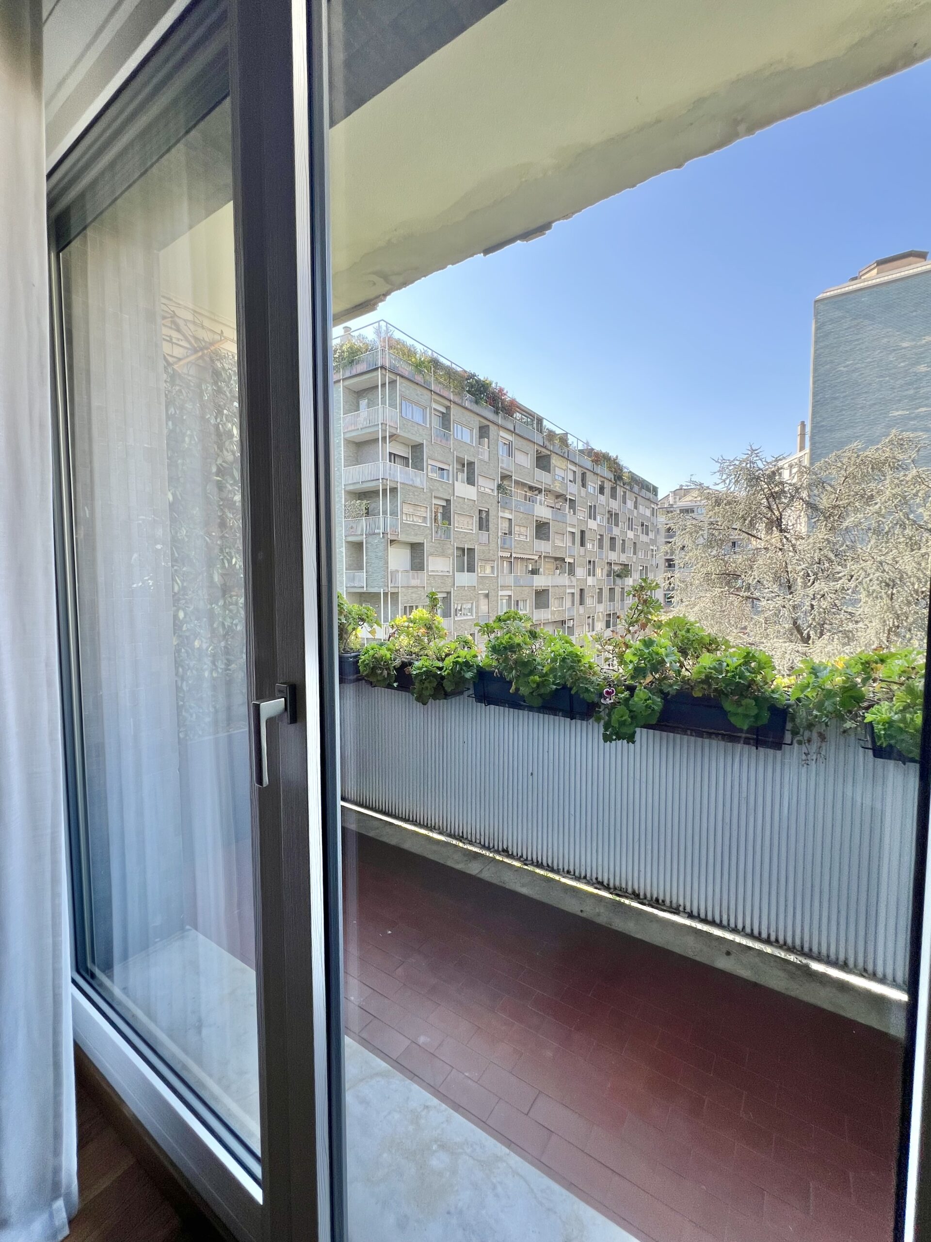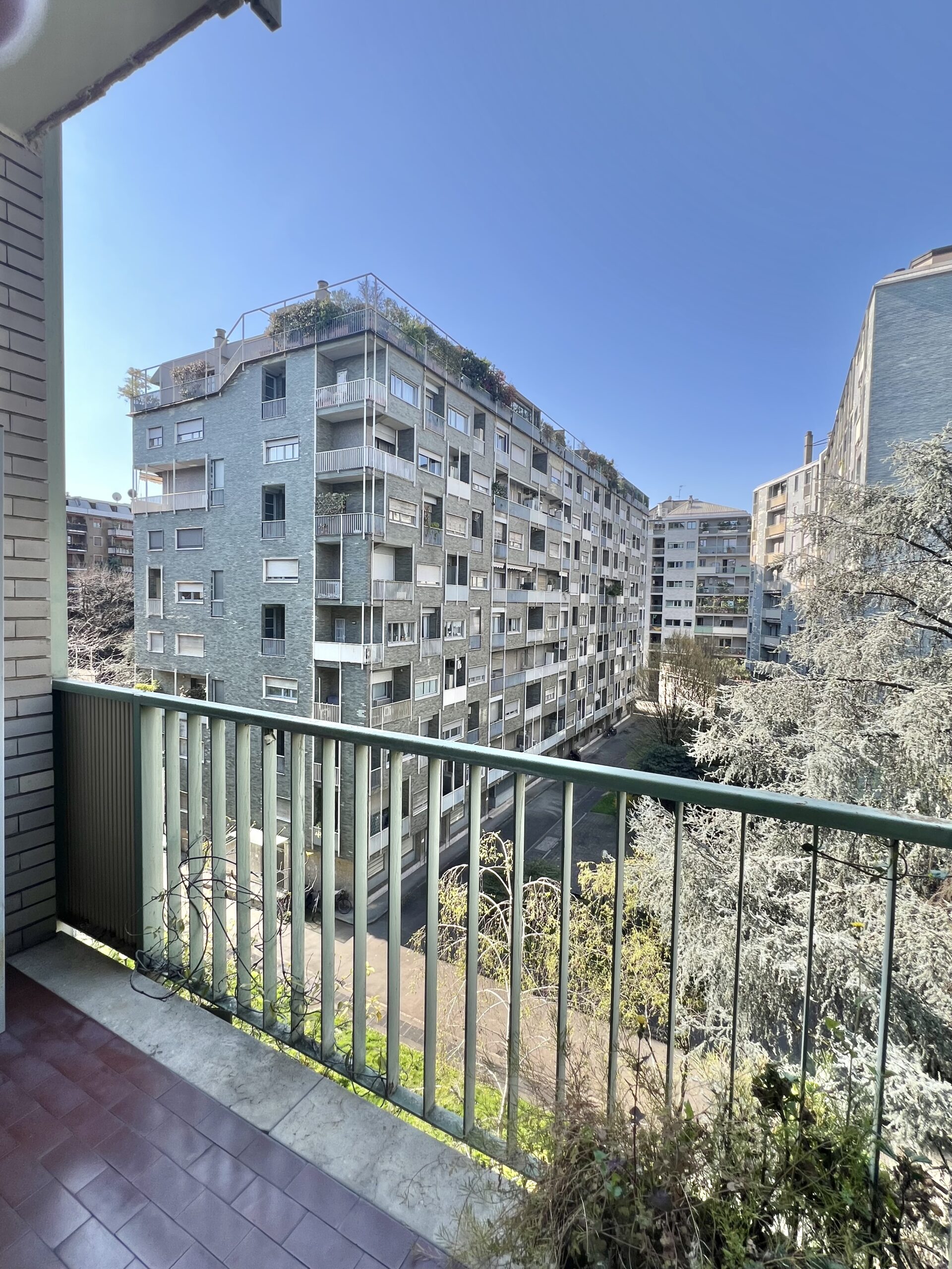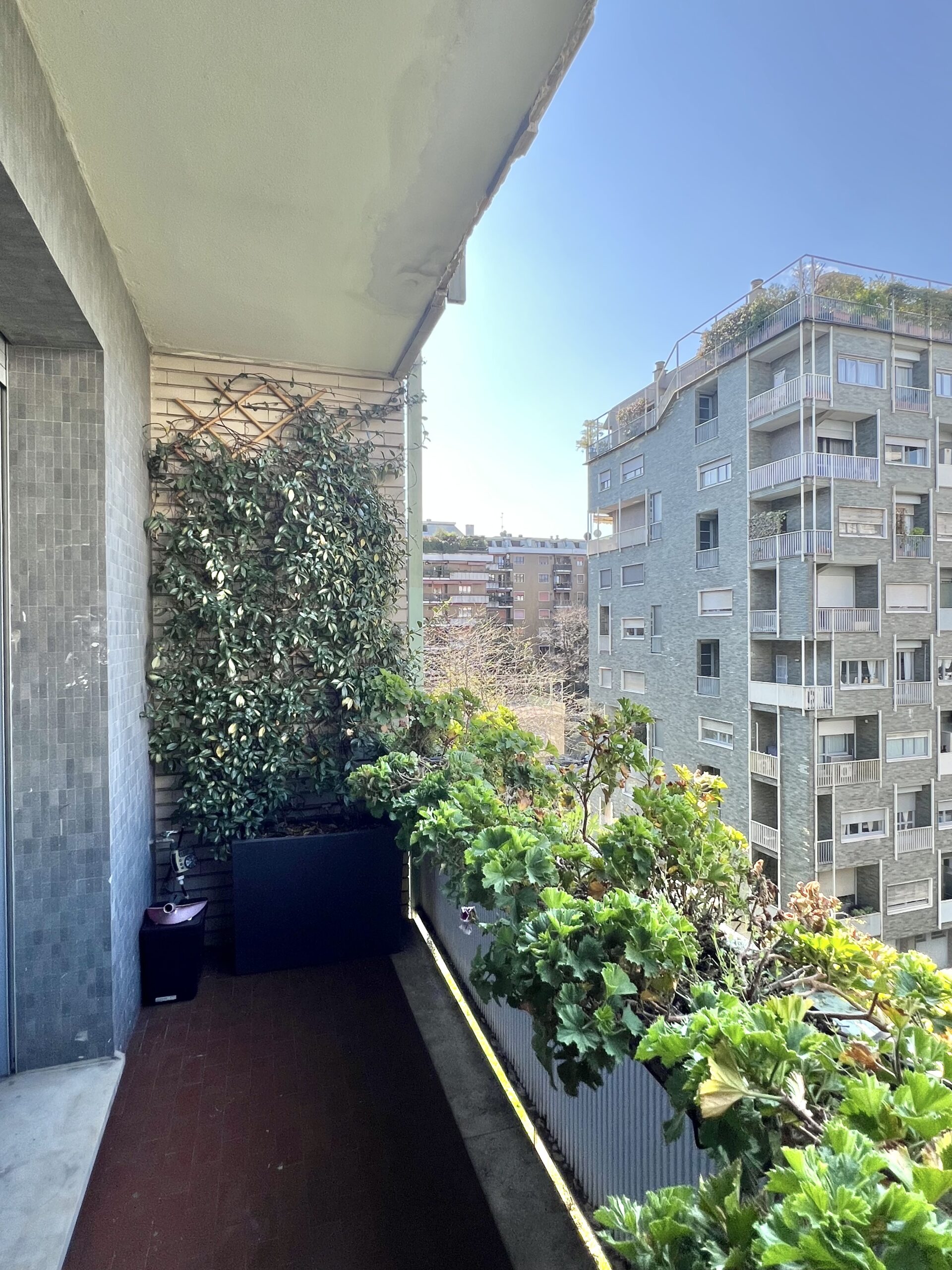 L’immobile, sito al quarto piano, è stato ristrutturato ed è composto da: ingresso, soggiorno con ampio balcone abitabile, angolo cottura, camera matrimoniale con balcone e bagno en suite con finestra e balcone, camera singola con balcone, secondo bagno e zona lavanderia. Completa la proprietà la possibilità di ampio box al piano interrato.